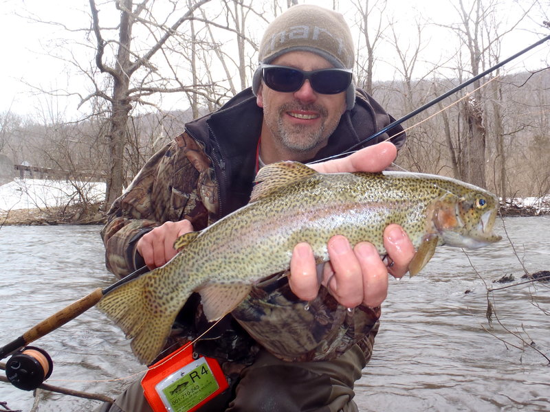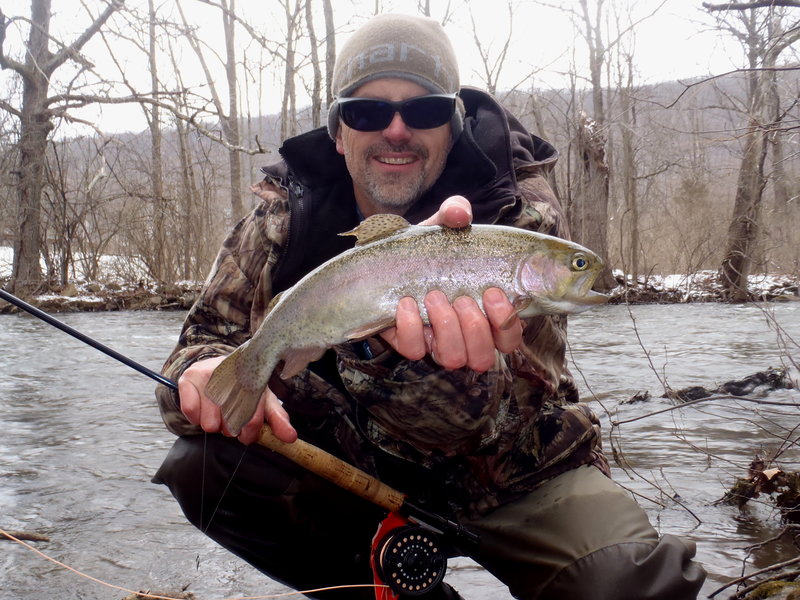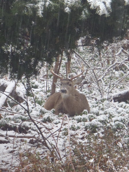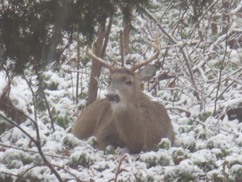 These Jan trout are dedicated to my dad, Elmer Vollenweider 83, who passed away last Sunday. Was given a folded flag from the US Navy and the VFW of Clifton shot off their canon 3X. I had given him a St. Croix fly rod years ago and he hardly ever used it. I retrieved it from his apartment and decided to give it a whirl on the Pequest today. Also photographed this 8 pointer bedded down in my backyard during a heavy snow. This Jan. buck had not shed his antlers yet.