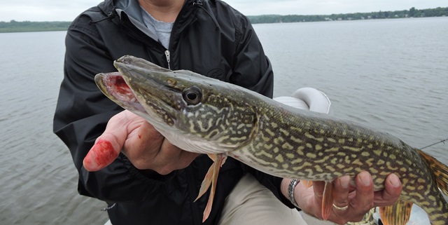 Hit Budd Lake to try for a few Pike. A little wet and chilly start but a we had a decent day. Total of 6 Pike...nothing big but they are a blast. And the last guy had his revenge on my thumb...I guess I need longer pliers. All caught on a Fire Tiger Crankbait or bluegill lipless crank. Also got a few LM a couple white perch and a Yellow Perch on the same baits. Not another boat on the water either. Few pics of the day.
