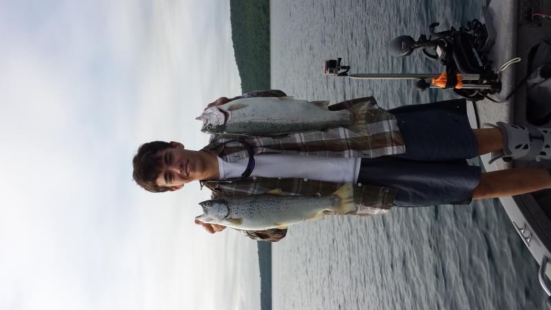 Hit round valley today and had a nice day! Started the morning of with a 20" bow that hit on the down rigger 30 feet down with a 3.5" hammered silver with orange and green stripes 75 feet behind the ball. Second was 15 minutes later the same rod hits and it's another similar sized bow and it net hooks and rolls out.... heart breaker! Third was a 21" lake trout 65 feet down on a laker taker flutter spoon. After all of those were within 30 minutes we didn't get another bite until 730 when a stacked rod on the down rigger hit and immediately a nice jump. When we got it to the net we were shocked to see a nice brown that was 19" and hit a similar flutter spoon 80 feet behind the clip and 25 feet down. Then a small rainbow about 17" on the planer boards that hit a pheobe. At 930 we hooked 2 Lakers landing 1 and losing the other. Nice day, good east wind and cloud cover in the morning seems to be the trick! Water was 72 - 74, lakers had small shiner fry in their bellies.