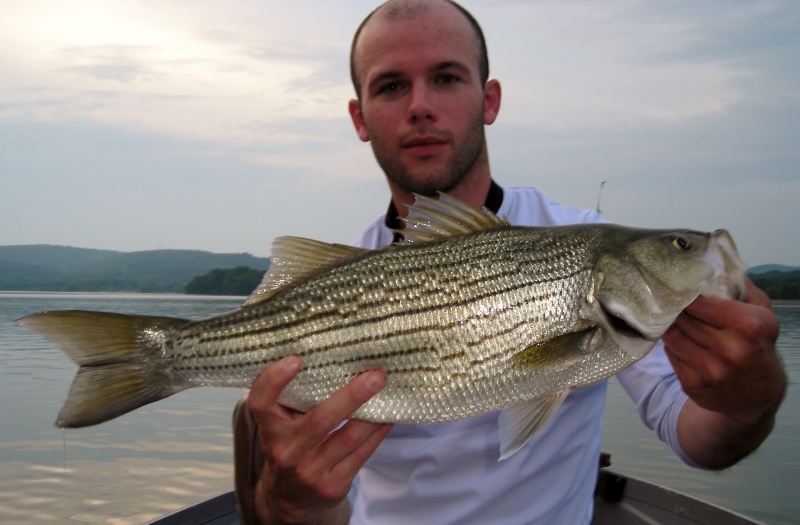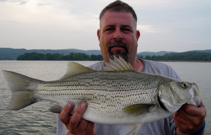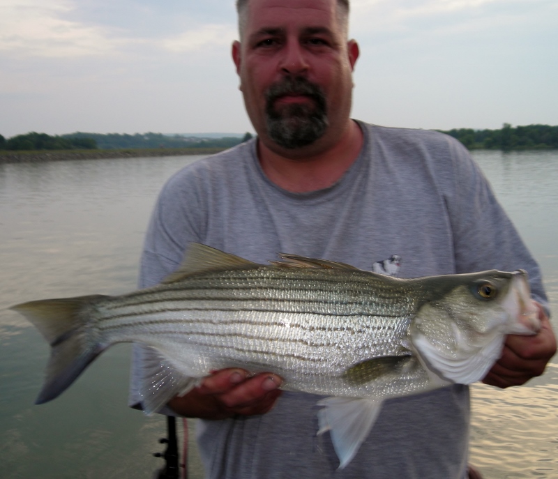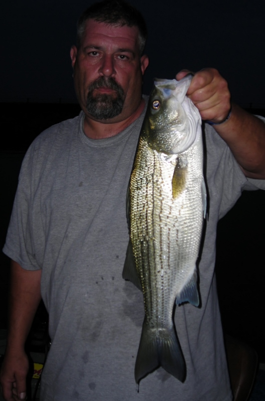 We found some marks a bit early, out in the open, and soon after doubled up on the troll. I grabbed one rod and brought the fish to the boat--teeny wiper, maybe 14". Dale grabbed the 2nd rod and it appeared to be a much better fish. A few mins after he goes "It's a nice pike!" Fish goes airborne off the stern, thrashing on the surface. I go to get the net while Dale continues to bring it boatside and all of a sudden, the pike lunges out of the water again--but this time lands IN THE BOAT off Dale's stern quarter, half way on the gunnel! He yells, "It's in the boat!" Not a moment later, the fish flopped, twirled, caught the 12 lb fluoro, and said sayonara! It was pretty hilarious. The fish was in the 30" range, but unfortunately, due to the "quick release", no pics were had of it. A great story nonetheless! We reset and trolled on. While underway, we see 15FOOTER moving towards an area where he's been bailing em' and we made a move in that direction too. For the next 2 hours both boats made circles around a nice pile of fish and had consistent hook ups. They were straight slaughtering the fish lol. They prob had 3 fish to every one we caught. It was craziness. Dale and I finished with about 10 fish, the flying pike and I was lucky enough to tangle with a 3 ft eel (nasty). The wipers ranged from the one 14"er we had early on to about 23-24" for us. Here's some fish porn... It was a good night. Looking forward to 15FOOTER's pics, too. They had some beasts! Good fishing with you guys out there last night!