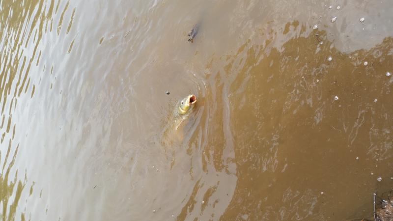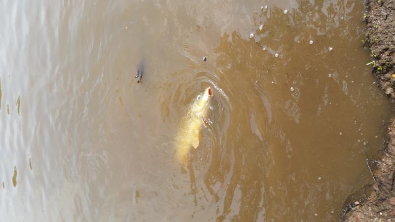 Today fished a new lake that I heard may have a few carp. I had limited time to fish between storms but I made the most of it. Pulled up to a Yoohoo colored pond with no evidence of life what so ever. Despite my now ominous feelings I figured that I would give it a shot anyway. I started by chumming the area with creamed corn and then got my gear from the car. I put corn on both rods one natural flavored and one with a little vanilla extract. I used pack bait on the weights and cast both into my cream corn slick. I was greeted to bites fast and furious. I missed my first two run offs and caught a small bullhead. I was getting pretty discouraged but stayed with it. Finally after a few more bullheads I got one that stuck. It nearly spooled me and put on a great fight. I was solo and didn't wanna damage the fish so i snapped a few in water pics and unhooked it while it was still in the water. They stink but I was on a hill and the pics don't do the fish justice. The egg sinker in the pic is 2 ounces for reference. Feels good to finally starting to get the hang of this carping stuff.