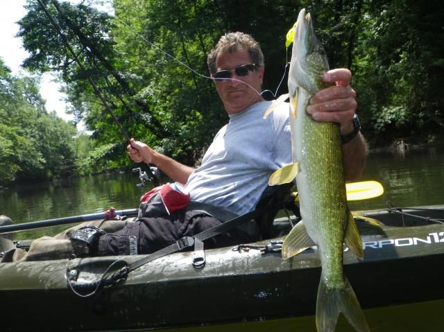 I hit the river in a couple different spots yesterday and landed double digits with the pike and also lost about as many. Nothing big, but 2 just over 30" and one about 36" lost at the kayak trying for a picture. Most were n the mid 20 inch range, but very aggressive ! I was just about to release this pike in the water when I noticed that it had a strange color pattern to it. Took a quick picture and then released.