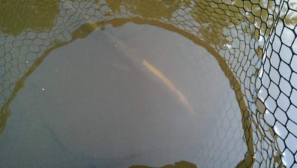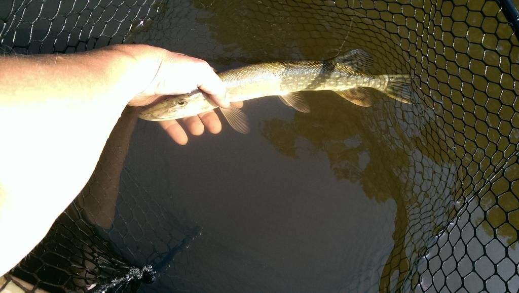 Hit the river for a bit yesterday. Got out early to avoid the oppressive heat and humidity. About a half hour in I hooked up with a small pike. Didn't realize till I got him in the net that it had an odd color variation to it. Kind of like 1/3 albino??