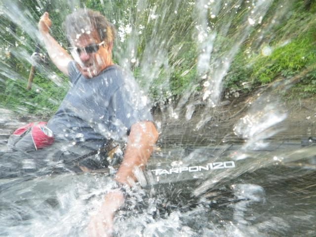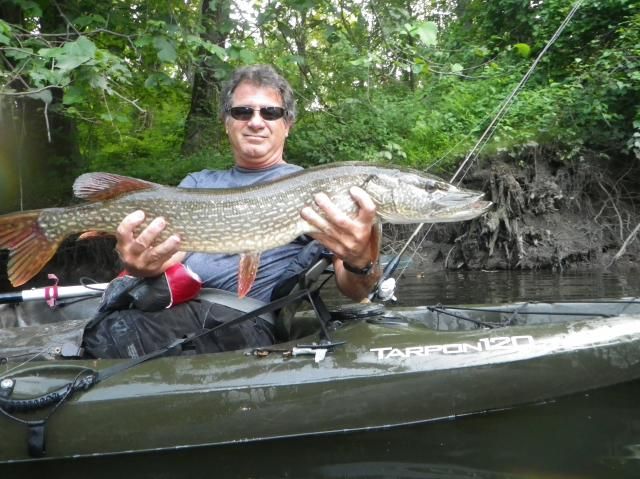 I love this first shot of the splash with the pike close to the kayak in one of the first picture attempts. You can really see the girth of this fish in the second picture. Trying to get an exact length was not easy, but it was just touching the 40" mark on my paddle.