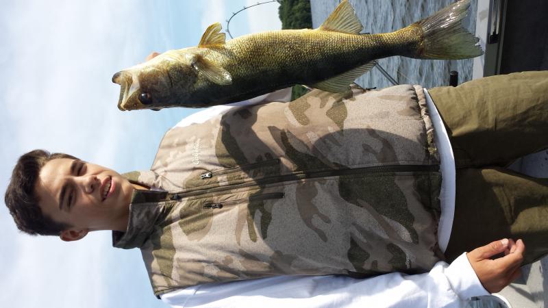 Definitely biting today. Caught 3 walleyes, 2 smallies and 1 largemouth. Trolled deep diving husky jerks and flicker shads for 4 hours until mom and dad were hungry and bored. Didn't get a measure on any of the fish in the name of a quick release! The small mouths were nice 3lbers and the largemouth was a 1.5lbs or so. 2 walleyes were like 18-20" and one of them was big. I won't say but the pic does it justice!