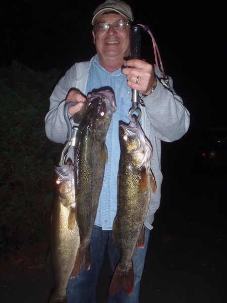 Promised my friend Chuck B. of Clifton we'd go out and fish...and have a nice dinner. Smacked this magnificent beauty on the troll....sailed in.....had a great dinner (chicken parm, barbecue shrimp, French onion soup), at a local restaurant on shore....waited for darkness then went back out and nailed a 3 lb. and two cookie cutter 5 lb. class walleyes. Happy Birthday Chuck! and many more...