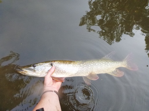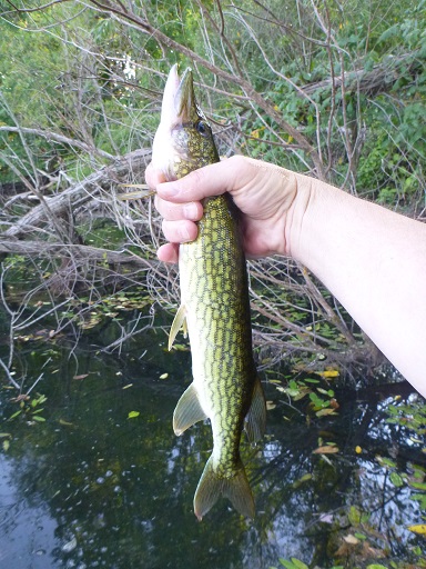 7 pickerel and 4 bass yesterday at a local pond and 1 pickerel, 6 pike and 2 bass today after work. Big pick went about 24" and the big pike 32ish. The one pike I'm not holding was in a small cove with 3 others. All were over 30" and this one well over 30". Not interested in anything I threw at it.