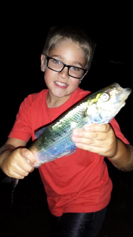 Later on in the evening, using the same swim bait down drifted along the current, Bubba hooked up with this guy....I am 99% sure its just a skinny striper, but the kid thinks it may be a herring? you can see how iridescent it is in the pictures, and the lines are not very pronounced...the fish was also dropping scales left and right, and didn't have what looked like a 'normal' striper dorsal along with a smaller mouth...also not the dot behind the gills...what do you guys think? (was about 14-15 inches, and attacked a soft plastic swimbait...here's the pics..