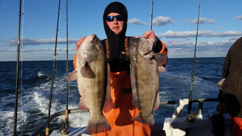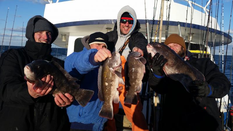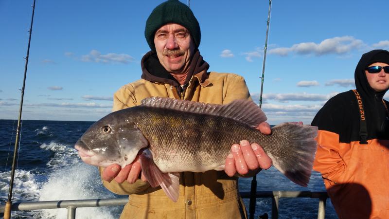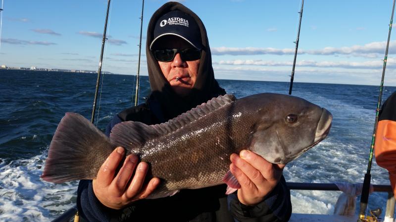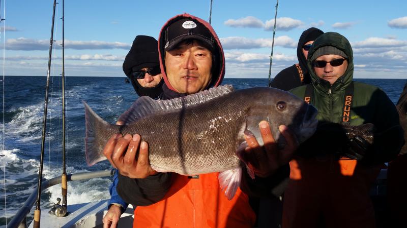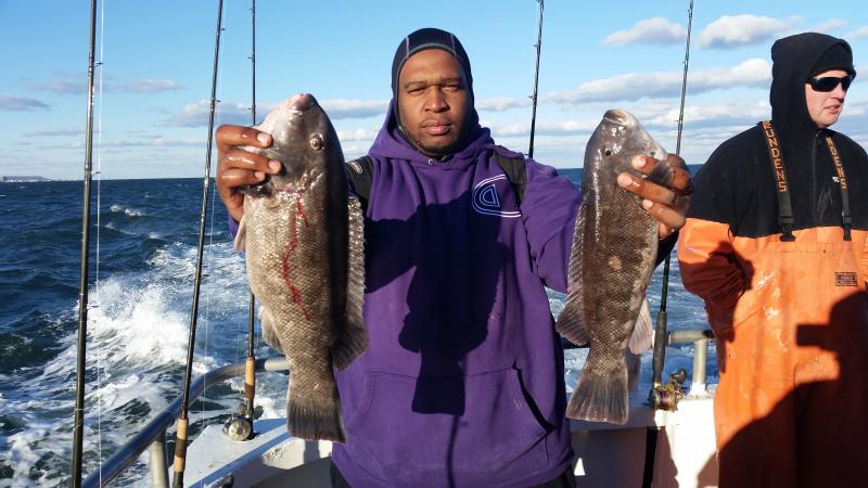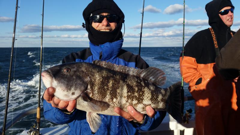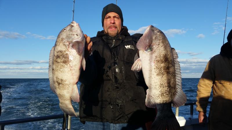 11-28-14 The wind was howling out there today,,,still the ocean was nice with the wind having enough west into it to keep it nice inshore where we were fishing...The bite was good overall I thought,,,high hooks had limits plus,,actually Chris had almost three limits of keeper togs,,,courtesy of his fish some people went home with dinner who did not catch today..You can see some pics below but a few things to keep in mind....The guys who caught were not in one section of the boat.........,we had fish everywhere today,,,maybe one side of the bow was better but the sides had limits to..........next,,,,,,light leader,,,light leader ,,,,light leader,,,,I tell guys this all the time,,,,80 lb.flourocarbon,,,60 etc....might work sometimes,,,but on my boat and the spots I fish if you want to be consistent you have got to be ready to downsize,,,,Top producers always have different size leader ready to go....Keep it simple to,,,I am not a fan of jewerely,,big swivels etc....also if your not getting a bite reel it up and change the bait,,,,also crunch the crab with your foot...it helps alot to draw bites when they other wise wont touch the bait...also cast it and move it around to different areas,,,alot of times I see everyone fishing straight down when they can cast out and find the bite....I could keep going on but I like to keep pointing these things out cause I get guys all the time that come out and wonder why they dont catch, and some guys do..Things like I just pointed out are some of them,,,the list goes on and on but,,,,,but,,,,some days your just in a slump,,,,no getting around it...enough rambling,,,remember tomorrow(saturday)we are sold out due to a blackfish tournament we are having...Sunday we are back open boat,,,so see ya Sunday morning....pics