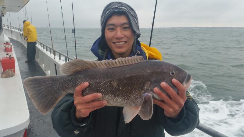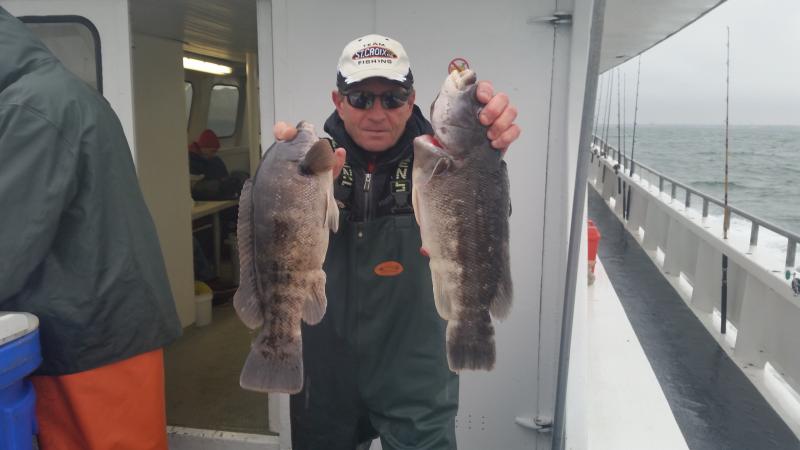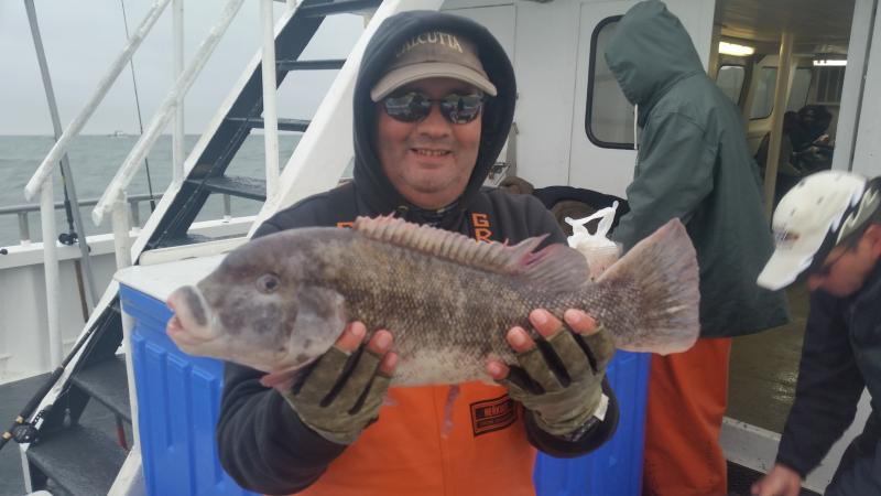 12-3-14 A little rain and a little swell but other than that not a bad day out there..We caught some fish to,,nothing great,,a pic at times,,,dogfish were a pain in the butt to but some of the guys caught a limit plus of blackfish,,some had a few or three etc...some guys had it tough and were sharking all day but it overall I though it was ok..Will(riverbassfishing)ended up winning the pool today,,actually had a tie for the ten dollar pool but he went home with the money for the most part...He ended with one short of his limit,,,,The ocean was settling down nicely with the west winds and tomorrow is looking nice,,Friday as well,,,See ya tomorrow!!!!!pics