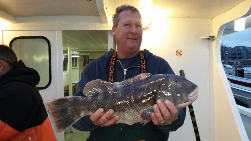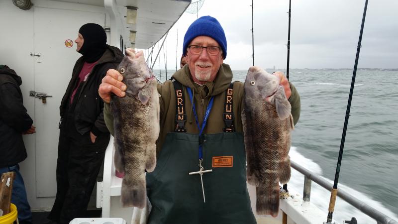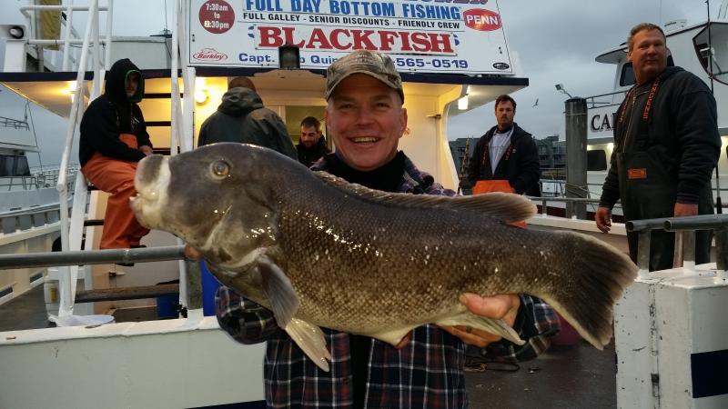 12-5-14 Cranky ocean today,,it blew pretty good out of the east and the seas averaged 6-8 feet all day with an occasional rogue wave mixed in....Fishing was good regardless,,Blackfish Bobby took down the pool with a Jumbo male Tog that went 11lbs.12 oz...He had his limit and busted off some other slobs....Some others also did very well,,,Joe and Kenny almost had a double limit of nice blackfish each,,,they were doing everything right today,,I know they to busted off some pigs,,, and in the back Bobby and Willy had just about a limit each,,some guys maybe one or two etc....but still some guys were not dialed in and struggled,,it was not easy today with the way the boat was dipping and weaving...Either way we had a nice catch overall..White crabs worked best today and tomorrow they are just calling for some rain and no wind so we are looking good,,see ya in the morning...pics.
