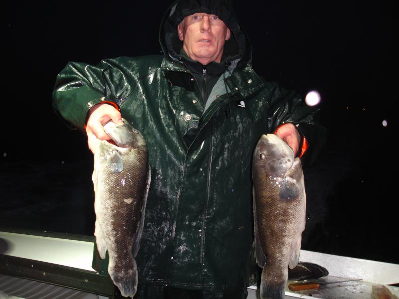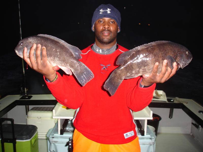 Today we ran an open boat Tog trip and the fishing was tough due to the horrific anchoring conditions. We played anchor drills all day, just could not sit still. It is hard to catch Tog when you have two limp anchors. Anyway enough griping, we still managed to catch some fish. Garret had 7 keepers (orl) and Pete had 5 and the pool and everyone had at least 4 keepers. The weather is going to be crappy for a few days, so next open boat trip will be Thursday.