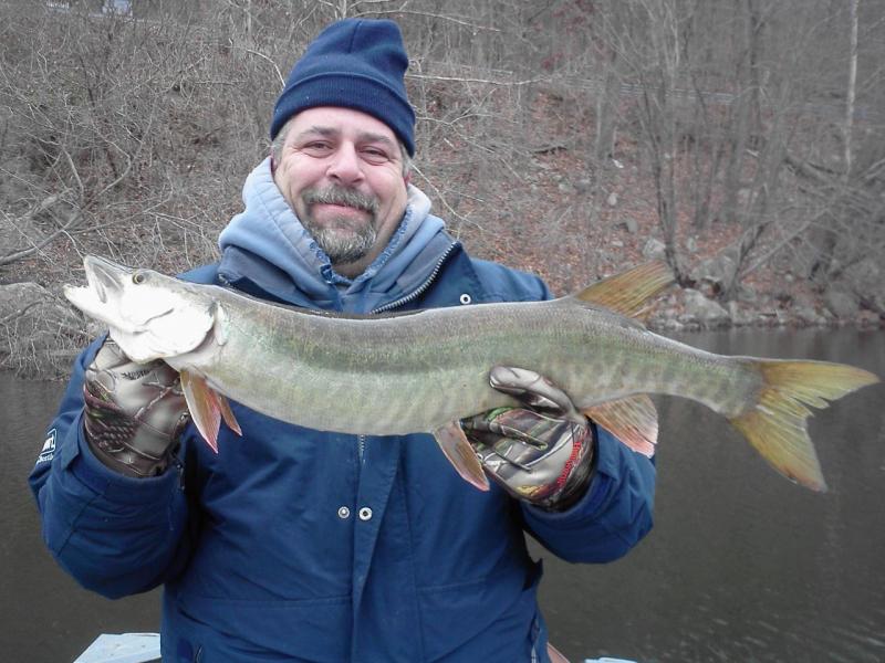 Been talking about it with Jigman for a few weeks now and decided today was the day. Spent the better part of yesterday morning fishin for bait as well as sending my partner in crime out to see what he could come up with also. We managed to wrangle up about ten nice sized suckers and planned on meeting at my house for a 5:30am departure! Jigman over slept so when didn't hit the water till about eightish. Rigged those suckers up and dropped them overboard with extremely high hopes of catching a musky even though we never even tried fishing for them before. Finally found some decent marks about four hours in and all of a sudden one of the reels starts to sing a little tune! The sucker was doing the freak and all of the sudden the lines starts slowly pulling off. I grab the rod not quite sure what to do and feed him a bit more before I wind down and feel the tug!!! I buried the hook in the roof of his mouth so hard Pete Mania woulda been proud!!! The fish made a few slow pulling runs in the 36 Degree water before we even saw it. I carefully play him out and get him to the boat where we finally get an eye on it. It's My First Musky!!!! Jigman swooped him up into the net and the hootin and hollerin began as well as my convulsive shaking from the freezing temps and that green mean machine!!!! Quickly We dispatched the fish with the billy club and then took some pics.