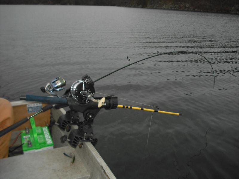 took an old barrel reel that i wouldn't trust fighting a fish anyway and stuck it on an otherwise useless crappy bottom half of an old rod. stuck that in one clamp on rod holder and attached a saltwater three way barrel swivel with weight clip on one side clipped to a 5lbs sash weight and a regular clip on another side. Then let my regular rod out with the lure i wanted to troll to the leader connection (modified albright knot). Looped a thin rubber band on above the leader knot and then clip the other end to the regular clip attached to the 3-way. once it's attached while slowly moving in the boat you just loosen the regular rod drag and then lower the sash weight by playing with the star drag until it starts letting out and pulling on the regular rod line. I marked the barrel reel line with a dark mark every two feet so i just count the marks going out and put the lure at the exact depth i want then lock the barrel reel. tighten the drag on the lure rod to your desired pressure and reel in until the rubber band is nice and tight. ready to troll! The rubber band doesn't always break with small fish but you can see them wiggling on there and a snap of the rod always breaks it. It's worked for me and cost me the price of a bag of rubber bands and the time to mark the downrigger line. pictures attached. any questions? |