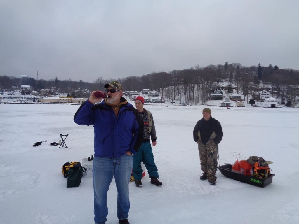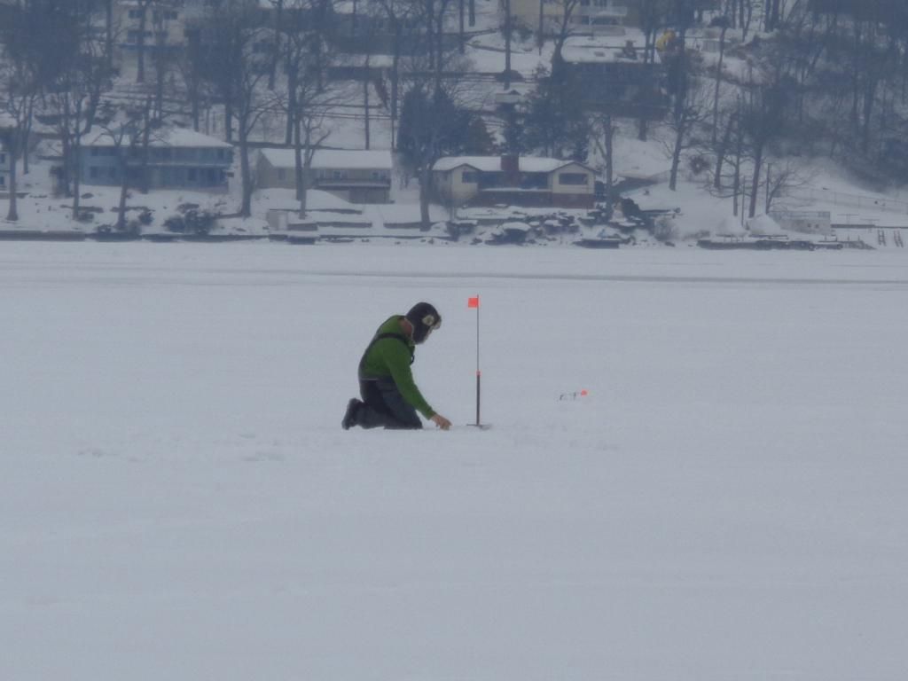 I was quite sore from the previous day and even though I dragged my sled out I really didn't plan on fishing today but thanks to Matt who was so persistent that I fished that when my back was turned he started dropping in Tip ups for me!!! I had a couple big boys on the hook looking for one of those Tiger Things LMAO!!