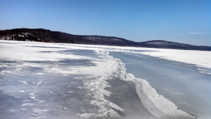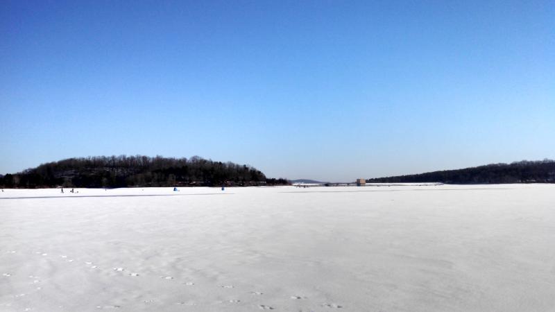 Ice was 8" of black ice with few inches of snow on it. Guys walked from boat ramp to other side over the pressure ridge and fished left of the dam and were fishing all out in front of tower to the left of boat ramp..