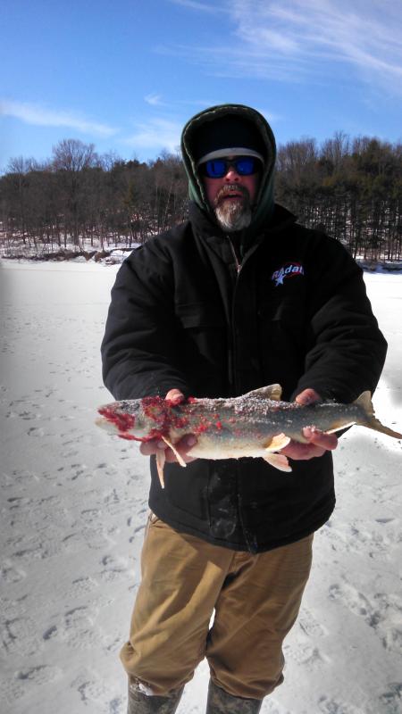 We missed two on tip ups and nothing jigging. Few Lakers 21-24" landed right around where we were fishing to our left(1 laker and a huge Pearch, Pict of laker), right and deeper out, landed 2 one on tip up and one jigging a spoon with a shiner on it.