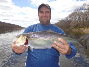 I started out on Sunday doing a float trip around the Shawnee area for shad. I caught 12 ( 5 roe, 7 bucks ) on both spoons and darts. It was slow fishing, with fish being caught at 8am, 2pm, and 5pm. Nothing in between. I also caught some of the biggest fallfish I've seen. I also saw the state stocking 2 tanks of walleye fry.