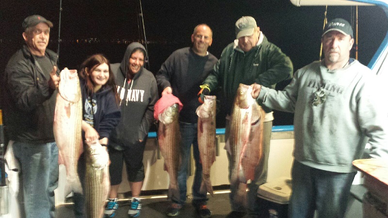 After 2 weeks of slow fishing we were due for a night like last night. We had blues on from the start with multiple hook ups and then when it slowed the bass turned on. Several nice keepers to 18lbs on board as well as blues for everyone. The bite is on so come on down. The weather looks good for the next couple of days so give Captain Dan a call to let him know when you'll be down 908-930-2335.