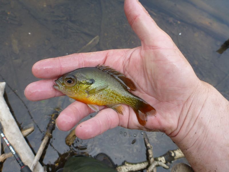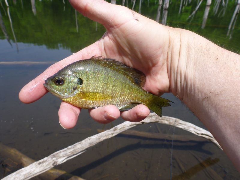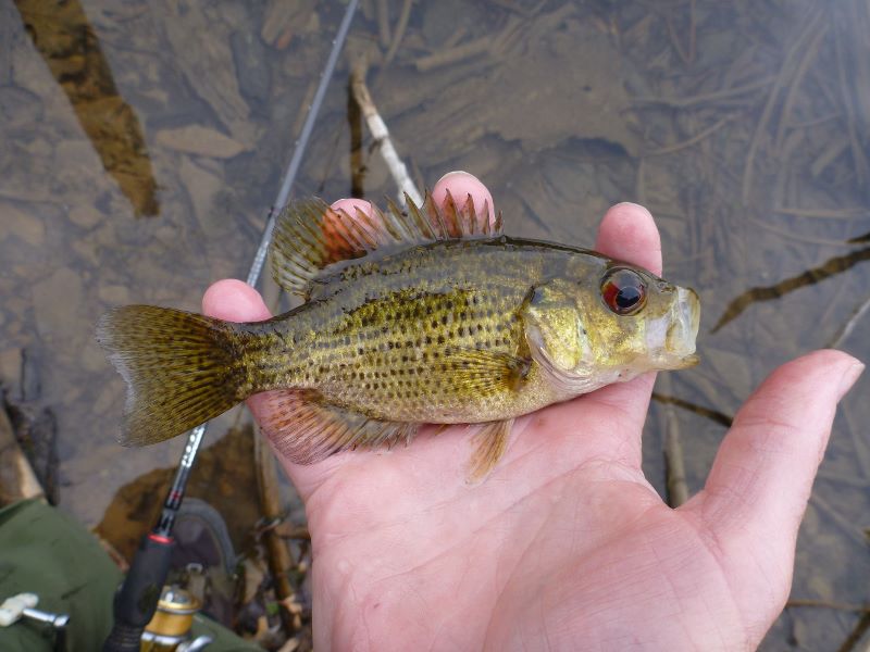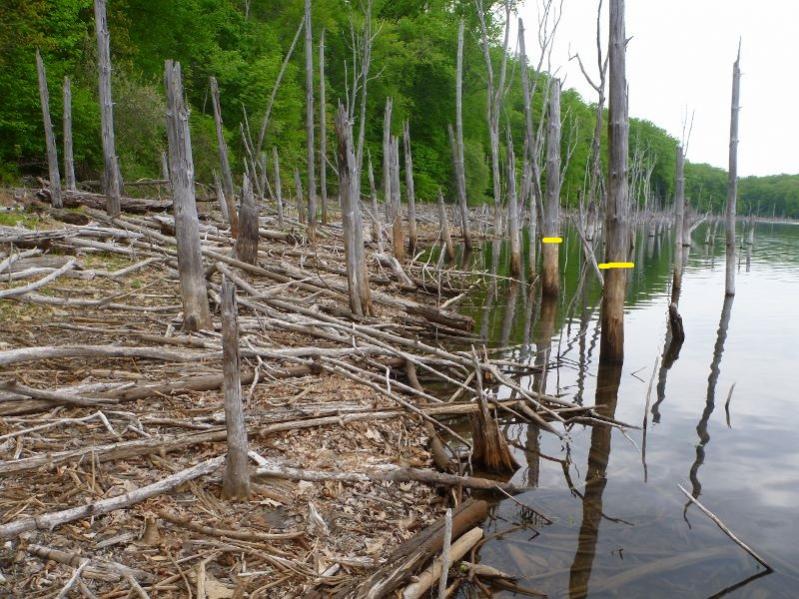 Damn its so low! Much lower than last fall. I'd say at least a foot lower since fall. Drew yellow lines on the trees to show the typical water level. Not much to report. Water felt chilly. Only thing really biting were rock bass. Caught about 30 of them. Also got 4 chain pickerel, a few sunnies and a couple small bass. Kind of a dink fest as nothing was over 9". Did see a few large lmbass on redds. I mean LARGE as in 22-24" large. I saw more kayaks then boats today. In fact in two hours there, only one boat came through the timber. Perhaps the low water has something to do with it?