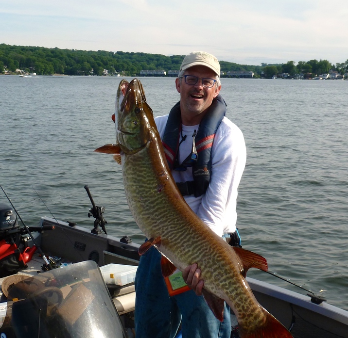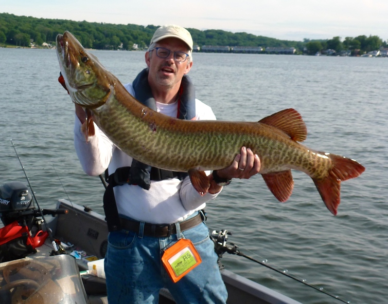 Biggest fish I've ever had the luck of handling....huge belly really broad across her back 49 inch class and I'd say 35+ lbs had a hard time heaving her out of the net.......Bucher Depth Raider in 45 ft. of water 25 ft. off the stern....thanks to the gentleman on the pontoon I waived down to help me with a few shots before release. When the rod went off, all I felt was weight! Trolled a bit in the morning into the afternoon with nothing. Switched over to fly fishing for panfish and had a ball. Around 5 pm went back to the troll......glad I did....Enjoy! Capt. Dave