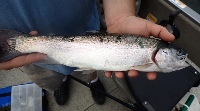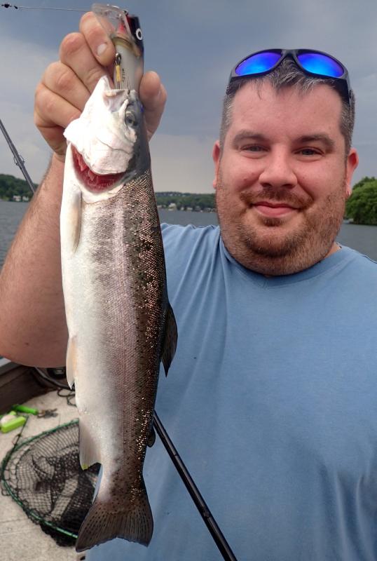 Out on Lake Hopatcong today.....slow....and rained on.....I put out a Wiley crank bait and a clip on weight system 100 ft behind the boat. A storm rolls in so we decide to vacate....as I'm reeling up this line I see a fish spinning around and around.....turns out to be gorgeous rainbow we musth've been towing around for quite some time without ever knowing it was on.....
