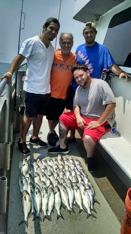 The blues were right where we left the them yesterday and they were hungry. Jigging was the the best method. The blues were close to the surface, just 10 to 30 feet down. Everyone caught their limit and released many more. We even had a sea turtle swim by the boat today. Other days we have spotted whales and dolphin. The pool winner was: 7yr old Yegor Kryvenka from Jersey City NJ with a 6lb bonito. It looks good for tomorrow. There are more fish moving in every day and they are now located in several different areas. The Big Jamaica is scheduled to sail every day at 730am. Night trips will sail Thursday, Friday, and Saturday night at 730pm. We also have space available for the Family fun trips sailing 430pm Sunday, Monday, Tuesday, and Wednesday. Fish and Fireworks trips sail every Thursday through August. Call for special package rates for the Family Fun trips and the Fish and Fireworks trips. For further information call 732 528 5014 or go to our website at www.bigjamaica.com