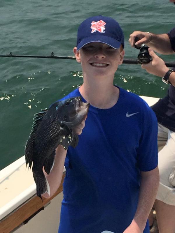 A couple of drops on wrecks yielded more ling, a pollock, and a few nice seabass. South wind came on pretty good after 1PM, so we called it a day then and headed for the inlet.