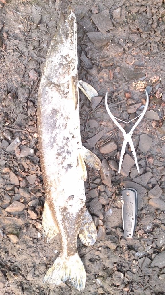 Not too costly or complicated to get the proper gear for pike. Being a novice to fishing would be the only excuse not to be prepared. So after physically watching guys get lures lost & line shredded on Sunday, seeing a 27"er laying dead upon my arrival yesterday, and pulling out some hooks with cheap fluoro attached from 2 out of 3 pike landed yesterday morning, I have to say...improvement is definitely needed! We all know BS happens some times, it sucks, and we try to change for next time. But if you could prepare for the BS before it happens, then why not. As members have said in previous threads, we need to practice proper handling for these, and all fish we don't keep. Ignoring the information soo easily accessible to all of us is just irresponsible. Amongst other knowledge shared, Buzzbaiter's end quote to all his posts is plastered in my brain and thought of BEFORE EVERY CAST..."Think about how to release a fish before catching one". I'll prepare 5-10min before my 1st cast everything I'll need: 2 pairs of long needle nose pliers, 2 jawspreaders, net if needed, camera settings and even a makeshift tripod for it, etc. Know what you & your gear, can & can't do. If it doesn't work, make it work, or leave it home. (I.e.), most anglers wouldn't bother using my pole because I have to tape it so the top half of the pole doesn't separate from the bottom half. Now I trust it. I've had a great reel that's older than me go because of one little piece I can't fix, so I leave it home. Replaced it with a trustworthy reel. We're constantly "scouting" for more fish in NJ. Scouts' motto...Be Prepared, gear up! ![]() This dead pike measured 27" and also had fluoro hanging out its throat. Curious what it had been eating, I opened its belly and pulled out only a lure. A Mikado Fishunter soft plastic shad with weighted hook. I don't use these. Save a fish, read these threads: http://www.njfishing.com/forums/show...ndling+muskies http://www.njfishing.com/forums/showthread.php?t=74079