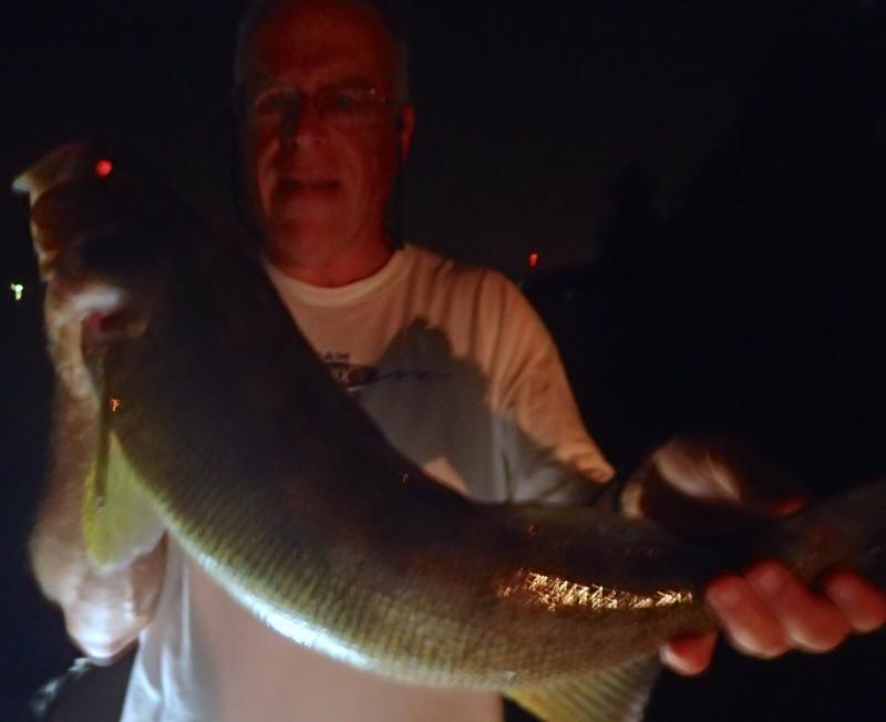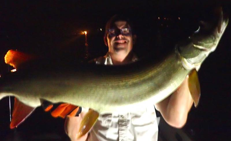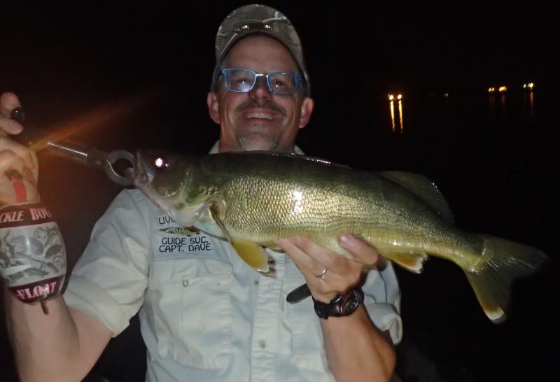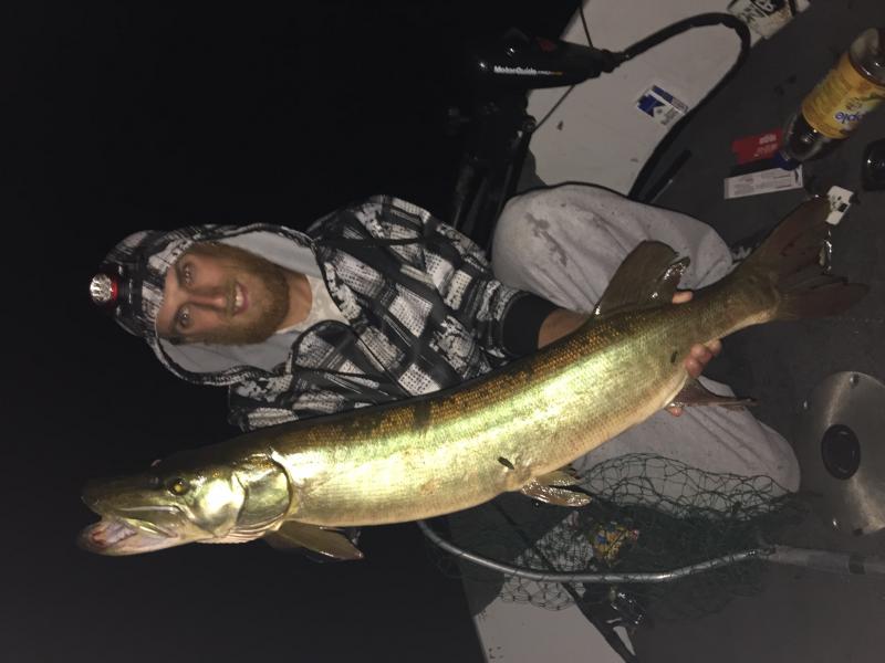 Out last night with a client from Fairlawn. We managed two nice walleyes (5 and 6 lbs.). I'm throwing a big Rapala on a B & M Crappie Rod and I get slammed. Then this giant musky clears the water.....under the boat...pulled rod right down to handle/reel seat.....10 minutes later we get the fish....UNBELIEVABLE....on a large plug intended for a large walleye and 8 lb. test. Fish swam off fine....enjoy! We were also visited by a GIANT Hawk Moth....the size of a small bat...humminbird....its eyes glowed like an alien.....what a neat insect...tried to capture a nice pic but couldn't because it was flapping it's wings.... Capt. Dave