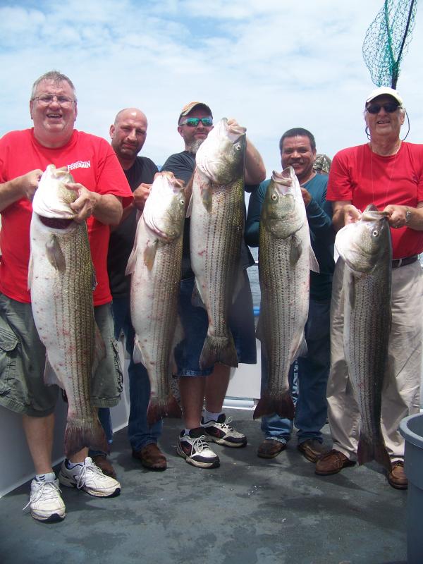 Highlight of the day was going to fish a patch of Rocks I always catch a Big one on the last of the tide, the fish finder lite up with readings that I knew were Striped Bass. I went to my spot to fish and in my wake, "WHITE WATER BASS"erupted!! The one shot of the day that made several guys very happy....Smallest fish 35 pounds, with several 40 plus!! Where the Hell were they a Month ago.