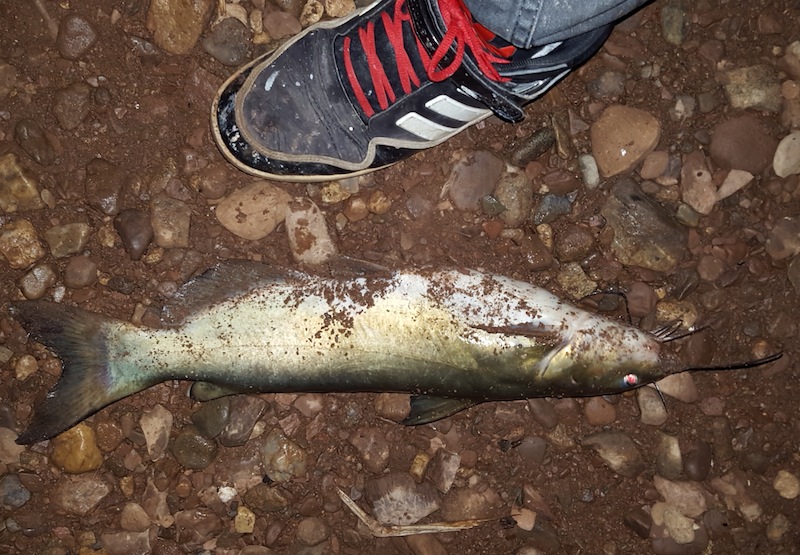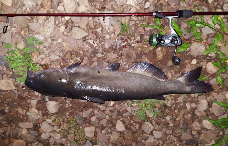 Hit the river at midnight last night. Water settled quite a bit since last time out--clarity was much better. Started off throwing soft plastics as per usual. Saw quite a few glowing sets of eyes in this stretch and could only get them to sniff and bump my offerings. I changed colors and sizes various times but they just wouldnt commit. Perhaps they were full or water temps are just too high for them to strike aggressively. Either way, it was good to see them in numbers on a different stretch of water. One of the eyes I saw was HUGH. Sitting right on the bank in 6-8" of water. She came up towards the surface, turned broadside and slowly swam away. her size gave me chills and had me wishing it was fall already! LoL... She wanted nothing to do with my swim bait.