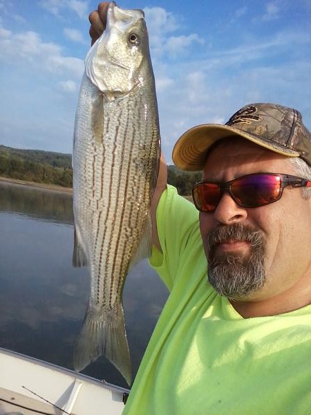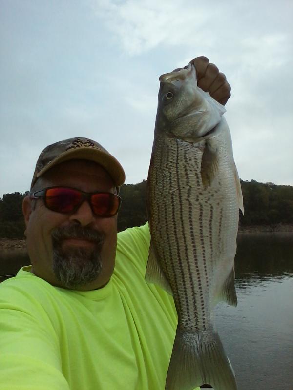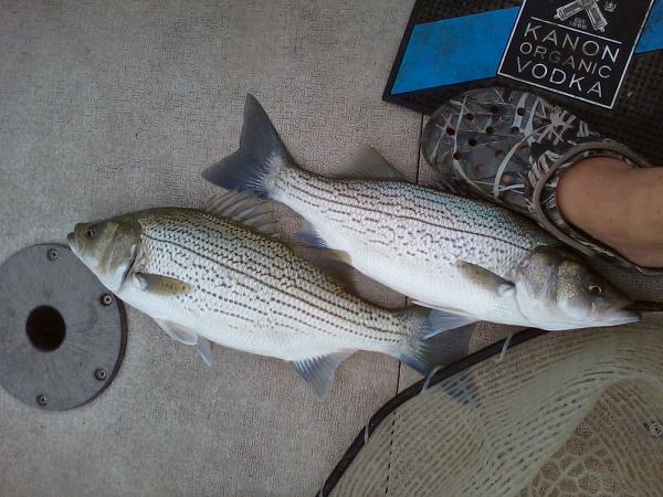 Last moment decision, 11:00pm last night I decide to go for it! Based on the forecast I was hoping to be on and off the water early, with out getting wet and maybe catching a couple of fish. Hit the water at 7:00am motored to the area and started to set out the rods. Fished the usual 4 rod set up and bait. Before I even got the 2nd planer board out it was fish on! Today was truly one of those days that if you are lucky that you experience only a couple times in your life! I had pretty much none stop action till I finally called it quits! My catch for the day was 24.......yes, THAT IS CORRECT Hybrids and 1 Channel cat for a total of 25 fish landed and released, This doesn't include several other fish I missed or broke off at the boat. After a while I was flippin them in the boat like Bluefish!!!