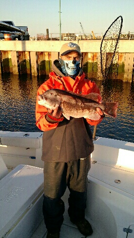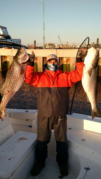 Anchored up for an afternoon tog bite. Had a big school of stripers running under the boat. Threw a white shad and game on. Bass bite begins on the ocean side within 2 miles of the SRI. So much for making the trip to the bay. Weighed one in at the Den 27 lbs.