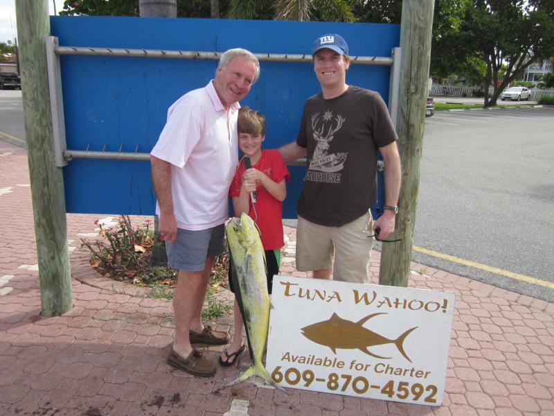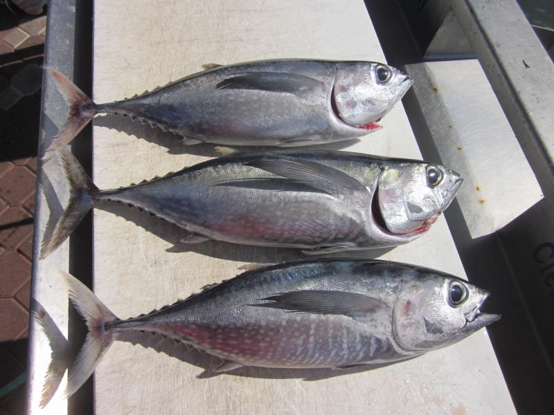 Ran 2 trips today, because of the lumpy (big) seas, decided to concentrate on trolling. After jumping off one big mahi, nine year old Dayton got into a big tussle in the morning with a nice mahi, he won ! In the afternoon everything seemed to shut down, kite baits were ignored, and the only thing we could find were some blackfins, but I understand they teamed up with some sesame seeds, wasabi, and soy sauce for a pretty good dinner !