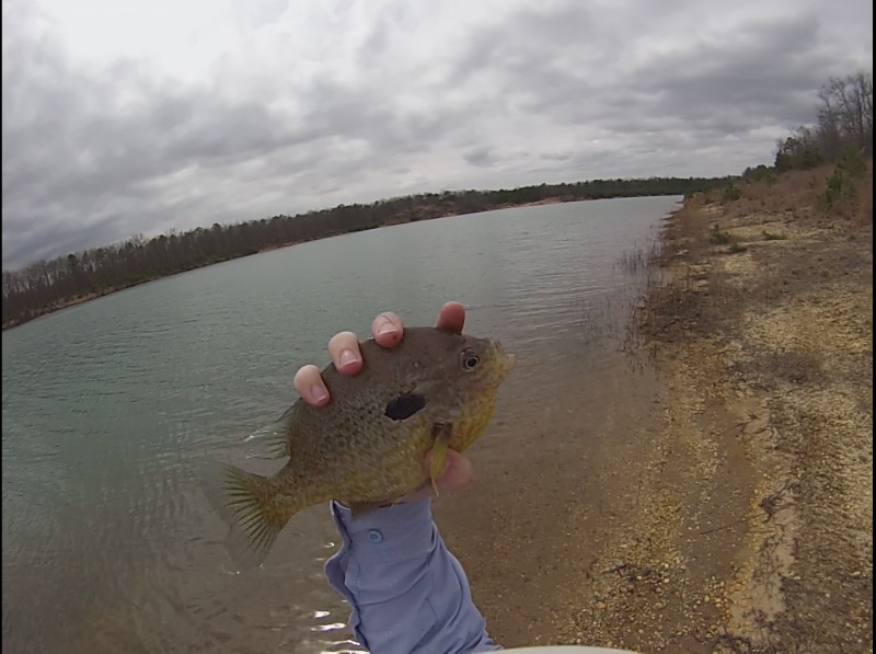 I found a pond on Google Earth over the winter that I have wanted to try for a while. With a lot of bass now moving up shallow for the spawn, I decided today would be the perfect day to scout it out and see what was going on. As soon as I got there, I started seeing tiny bass in the shallows. They were everywhere, tons of them! Only saw a couple of larger fish however, and getting them to bit e proved to be a challenge. I worked around nearly the entire pond, catching about a half dozen bass (and one behemoth sunfish), none of them over a pound, an most not more than a few inches long. Eventually I found a log in the water, the only piece of real structure I had seen all day. First cast with a lipless crank, and something hammers it! A 4-pounder rocketed out of the water, and after a brief fight I was able to land my biggest largie of the year so far.