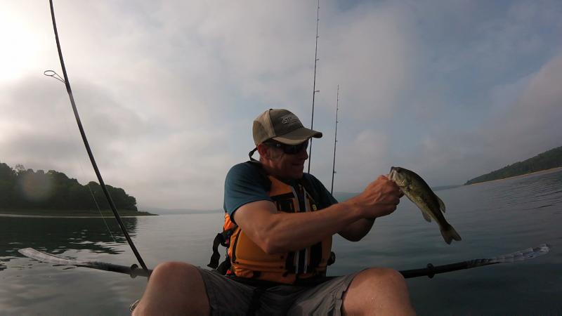 Next time I'll paddle out in the dark.Nothing big but managed 3 largemouths then got out of there as the weekend armada slowly but surely was making it's way onto the water and to be sure to get out of dodge before the real hijinks along the shore started. Couple of pics, including the death-struggle trying to get wacky-hook out of the boney mouth of a whopping 8 oz fish.