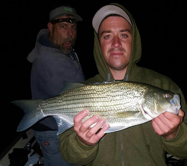 I had a 20" fish early on but no additional action for about 2 hours. As other boats began slowly packing it in we kept grinding...casting and casting and casting endlessly. We hit one spot that provided a flurry of action where 3 or 4 hybrids and a smallie were hooked, landing 2 brids and the bass. The bait activity and explosions began to intensify. Doubled back to another area and the action was turned up significantly. With no other boats around we started to find more consistent action--strikes, missed hook ups, dropped fish and multiple linesiders landed on the boat. When all was said and done we had a decent night with 12 or 13 hybrids and a smallie brought to net and prob just as many strikes or dropped fish. I finished with 7 or 8 hybrids to 23". Dale had 2 or 3 to 22" and the smallie. Jimmylivebait managed 2 to 22". It was a great night. Endless ball busting and joking from 1130 to 4 am. Good times fellas! The bite is def getting later and later. Pretty much too late for week nite trips. Fat lady's coming! Pics below