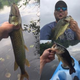 Kayaked on lower twin lake on Thursday. Snuck out for two hours between showers. Grabbed 3 big pickerel. A very well fed lmb and a perch. Been working and fighting the weather(thank god that wind is gone)