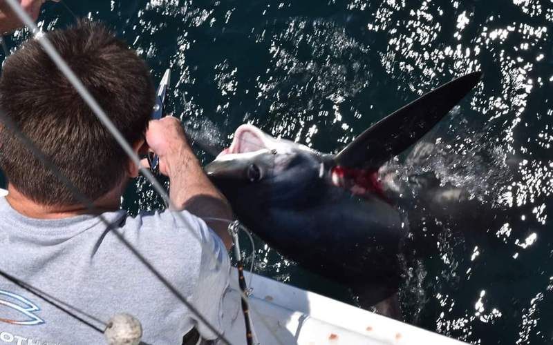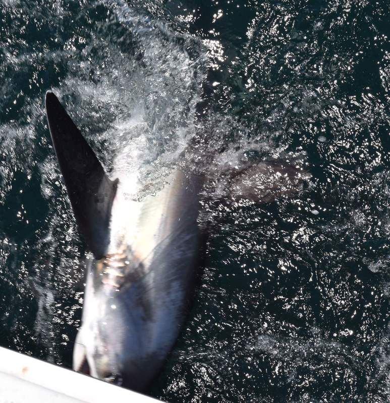 Awesome report! Three threshers hooked regardless of the outcome is one heck of a trip. Quick thinking splicing the line, not easy to do with a shark on the other end. Hand lining a shark to the boat, have to admit not sure I would have tried that. Those are days you live for on the water, great you were at the right place at the right time.