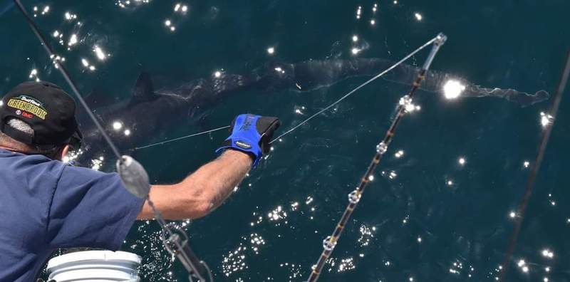 We got a late start, and after catching bait and running to the spot, we set up around 1145am. About 20 minutes later, the deep rod bends over. I grabbed the rod, and in about 15 minutes I had my first thresher shark alongside the boat. After a few quick pictures, we released the 130 to 150lb class fish.