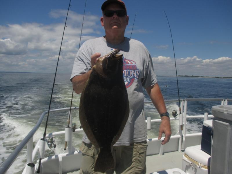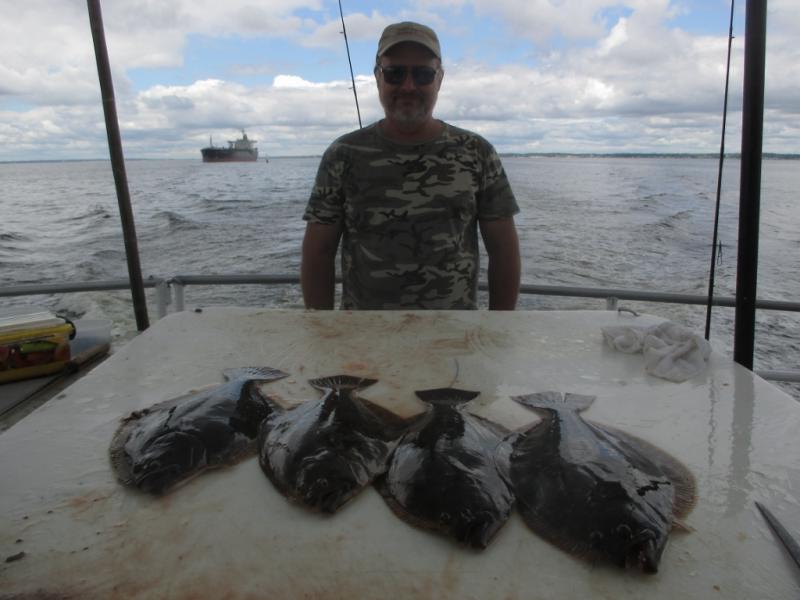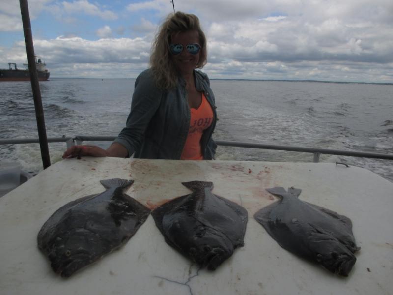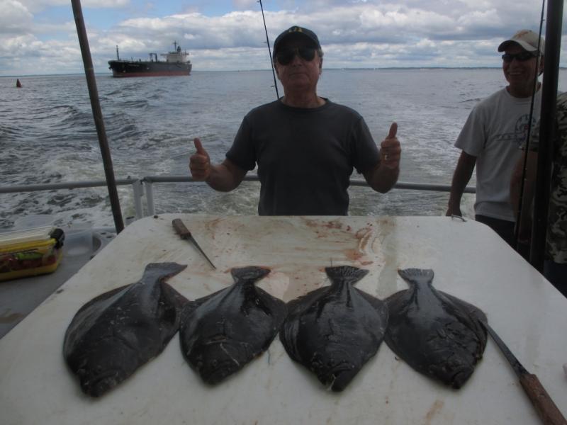 It was a slow start today with very little drift but when the tide changed the fluke got hungry and we had good fishing with a lot of shorts and keepers boated. just when it got good we had an outbound ship kill it. You can see him follow us out the channel.