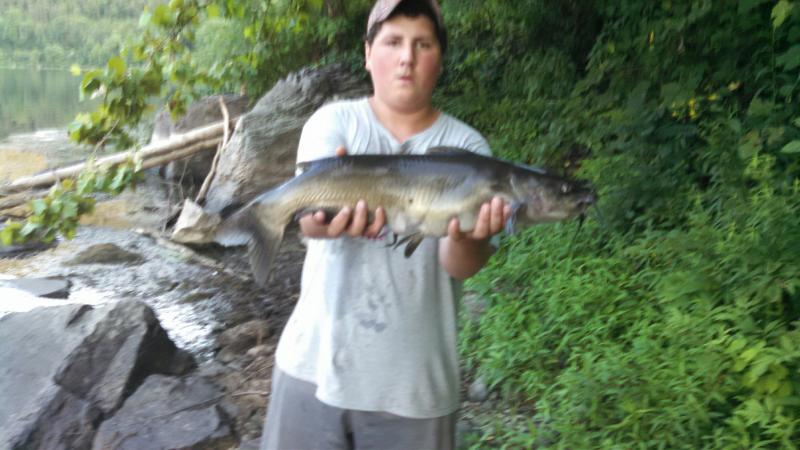 My son and myself arrived at the Big D about 6:00pm. I set up 3 rods for catfish and we threw grubbsters, jerk shads and various toppwaters while attending the catfish rods. We caught a bunch of smallies, pan fish, 1 large mouth and some kitty's. No small schoolie 10-14 inch stripers this evening which I was surprised cause they have been all over the river last couple weeks. Fished small live sunnie's on one of the catfish rods all evening hoping for Mr' flathead but only a channel catfish and 2lb smallie thought it was tasty. Here's a pic of 2 of the nicer catfish we caught before they were released.