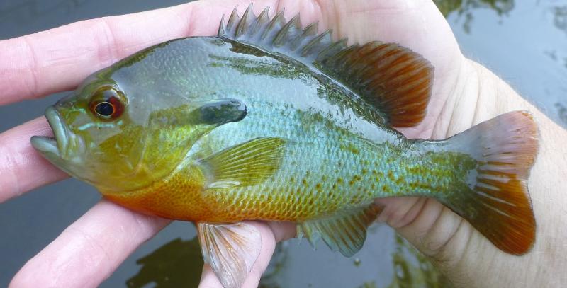 Later fished a river from 8:30 to 11:30 picking up about a dozen smallies and many Redbreast sunnies. I tell ya wearing waders, boots and a vest with 5 lbs of junk on a day like today is rough even when standing in water up to your waist