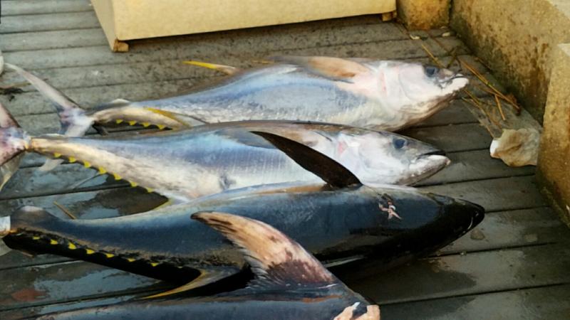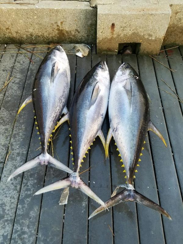 We had to go a long way - almost 130 miles but we caught a few TUNA - all Yellowfin, a Swordfish, and we lost a bunch of fish too. Some fish were on Run Off hammer jigs and some fish were on bait. It was an improvement over what it has been.