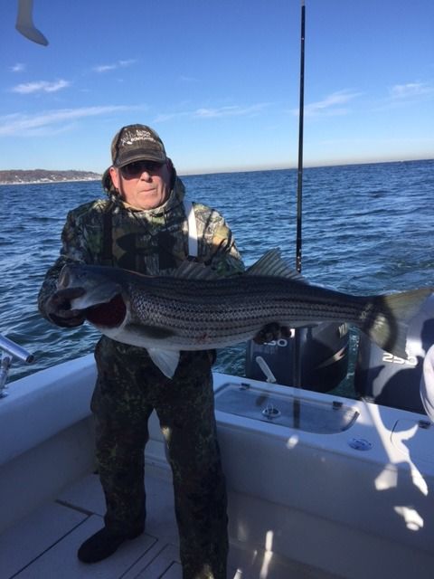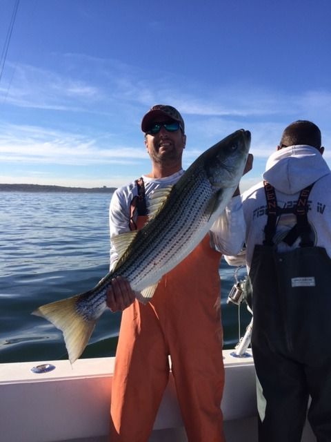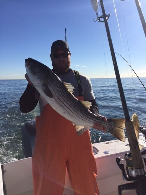 AM- Had Karl and the boys from south jersey out this morning for some stripers. Headed to where we have been catching them the past few mornings to find a large swell and scattered bait everywhere. After a few attempts at jigging, we put out the trolling gear. Slow pick all morning going 4 for 6 on the mojos with nice fish between 15-25 lbs.