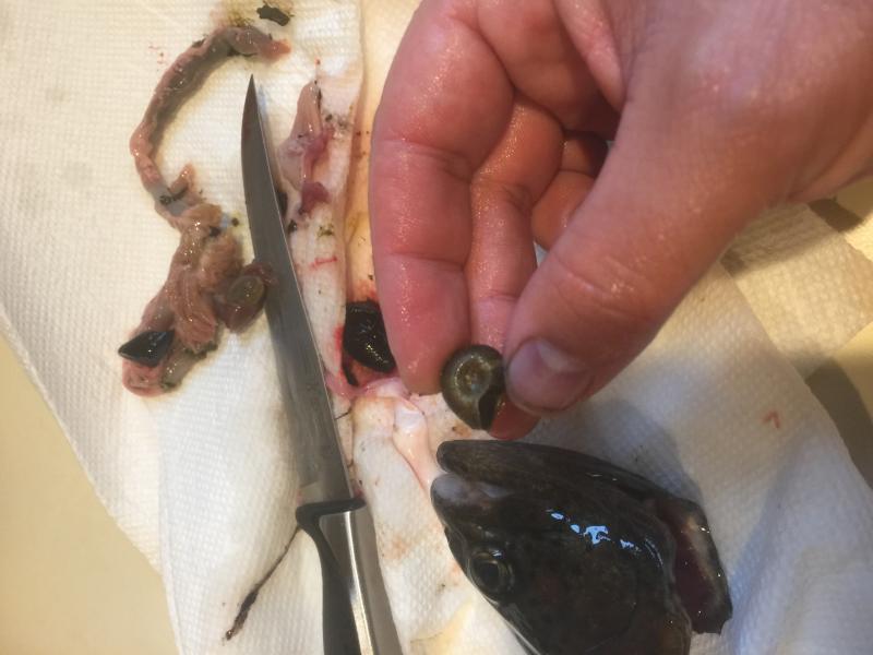 Been bushwhacking along the very low Ramapo and Wanaque lately. Fish are very picky in the lean water. Been picking on the stockies, and occasionally the pq for some browns. I kept a stockie today(gut hooked-I watched him inhale my "secret" bait) and was late on a hook set. Anyways- skinny of it was,he had a snail in his belly. All stretched to fit physical stomach was like a drum, shell was empty but there was mostly digested food on both sides. Someone had something like this - I think this spring. Anybody?