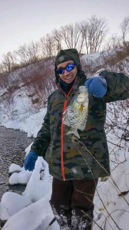 Landed a nice crappie, released and kept fishing. Next few cast…BAM…Fish On. Big girl too and I landed her clean. Ide say approximately 4lbs. How great is this I thought to myself. 4lb-r in freezing temps and fresh snow in February. Jon landed a small bass and a few nice Crappie. I set the hook on something that hit hard and she tugged left and right and tried to run and go deep again. Got her to the shore and was like WOW, big big girl. Went to lift her out of the water (without lipping her 1st) and she snapped the 12lb flouro leader. I literally jumped in the water and in one swift motion scooped her up with my hands and tossed her onto the fluffy snow. (hence why she has snow on her in the pictures). Snapped a few photos and put the big girl back in. Too cold and fingers weren’t really working anymore to re-tie my line. I said F it, I’m done fishing. Just sat and drank my beer slushy beverage and enjoyed the rest of the outing. Jon caught a few more crappie and we took off before our fingers turned black. |