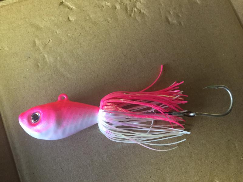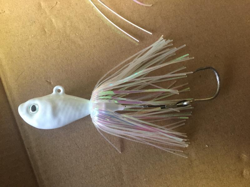 The price of fishing the sticky stuff is too high (I built several artificial reefs using Spros) so all I use now are unpainted jigheads tipped with Gulp! and Spearing. A teaser 12to14" above the jig is also tipped with Gulp! and spearing.