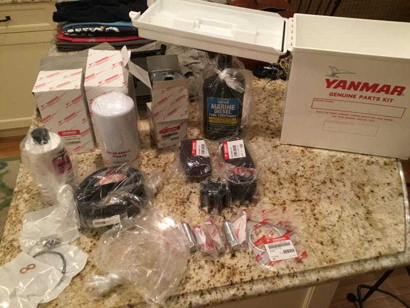 2 oil filters, 2 air filters, 4 zincs, 1 marine diesel treatment, 1 FPPFcooling system treatment, 2 belts, 2 impellers, gasket, and Yanmar parts box